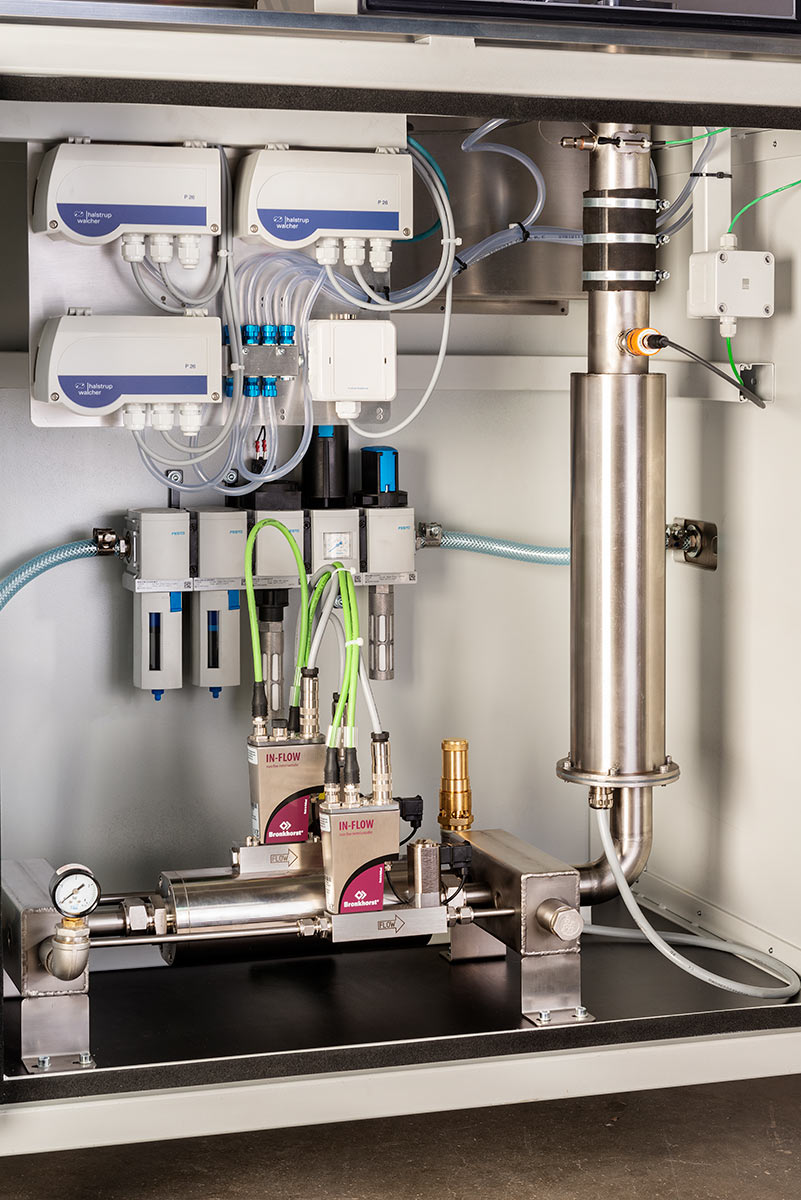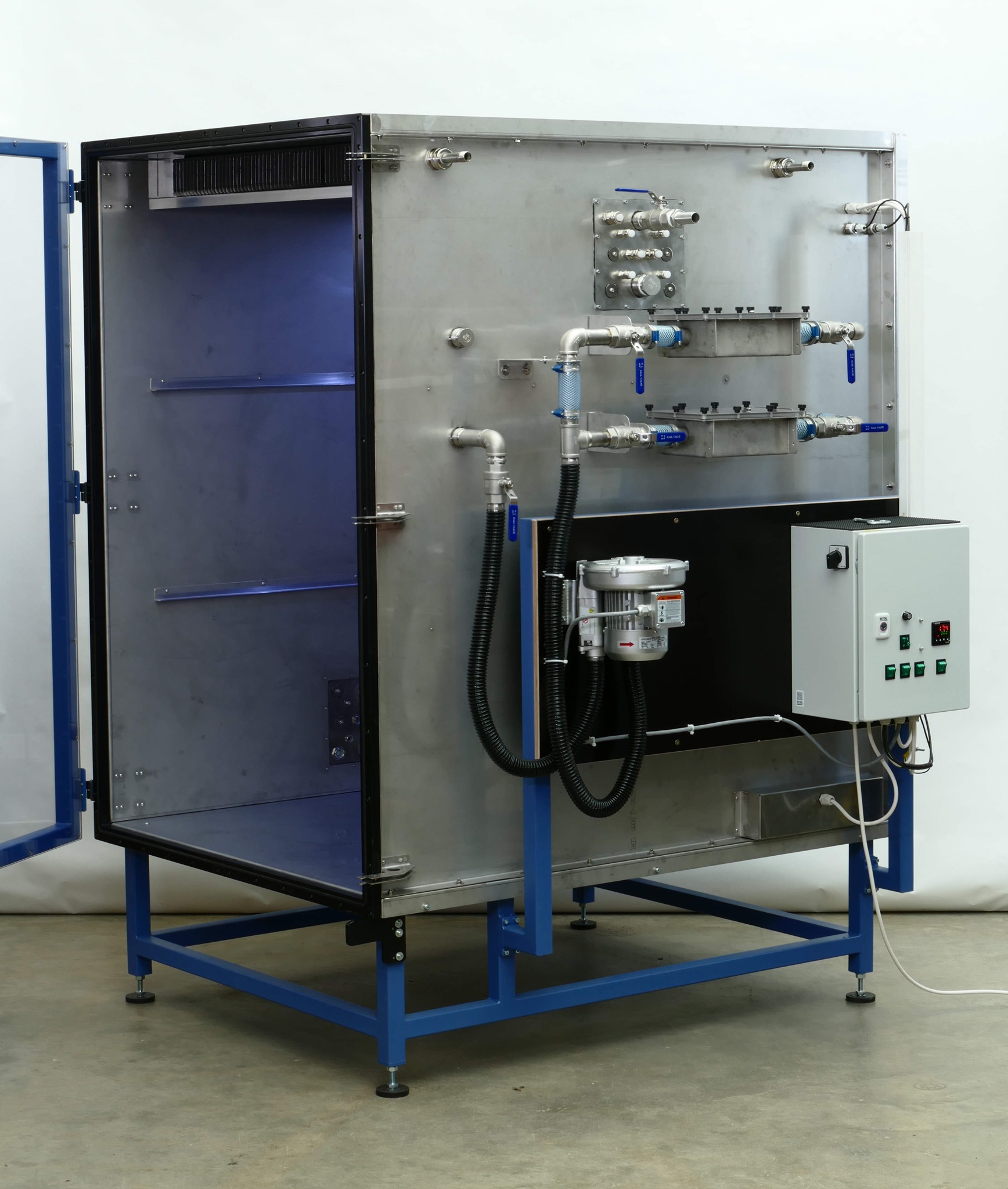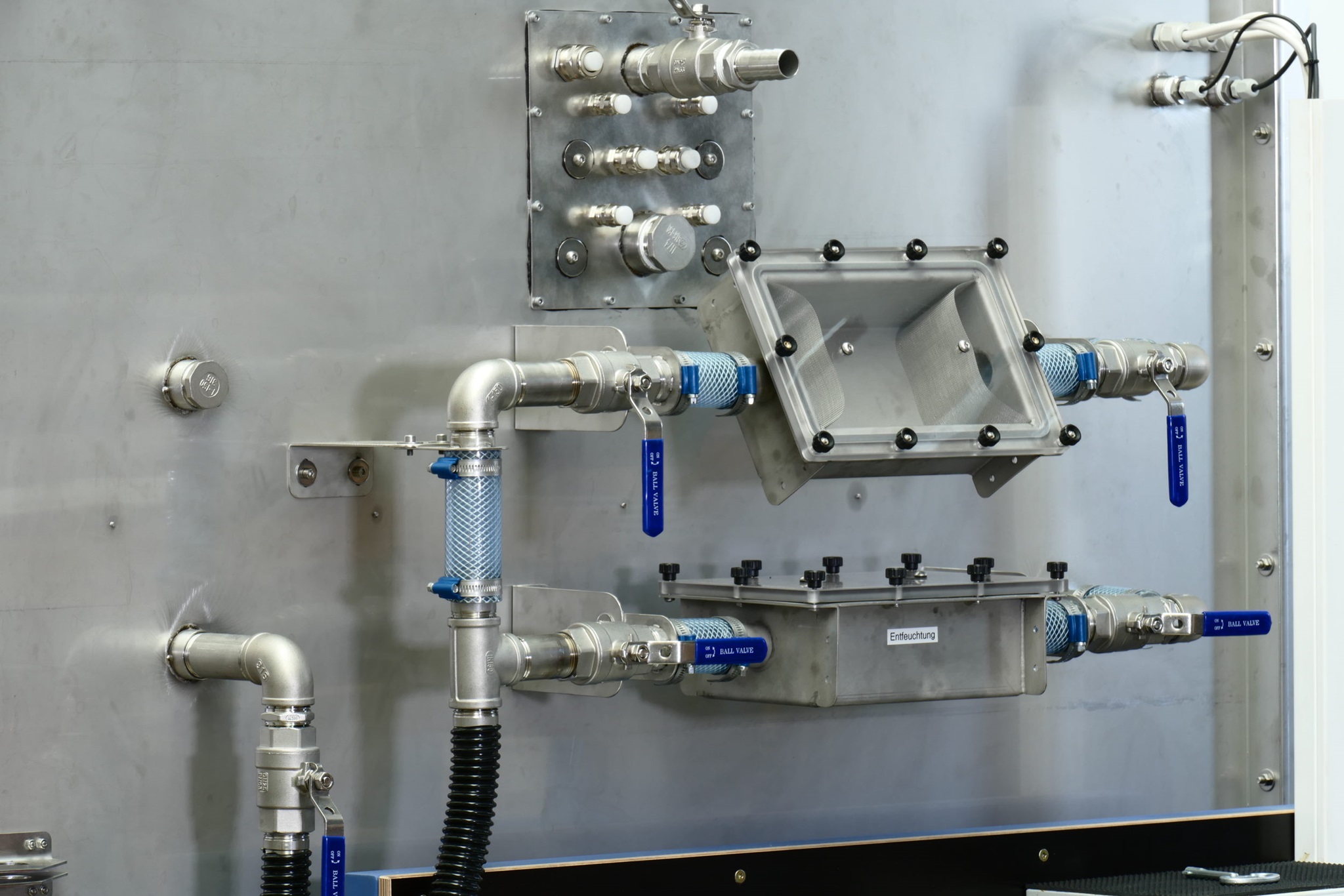 Dieser Prüfstand wurde in enger Zusammenarbeit mit dem Kunden konzipiert. Er erlaubt eine präzise Einstellung von Luftfeuchte und Temperatur. Auch aggressive Prüfgase können aufgegeben werden, da korrosionsbeständige Materialien Verwendung finden.