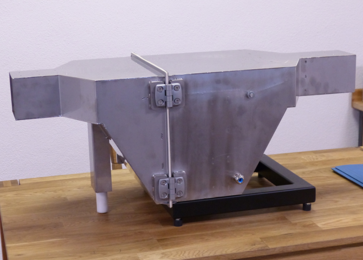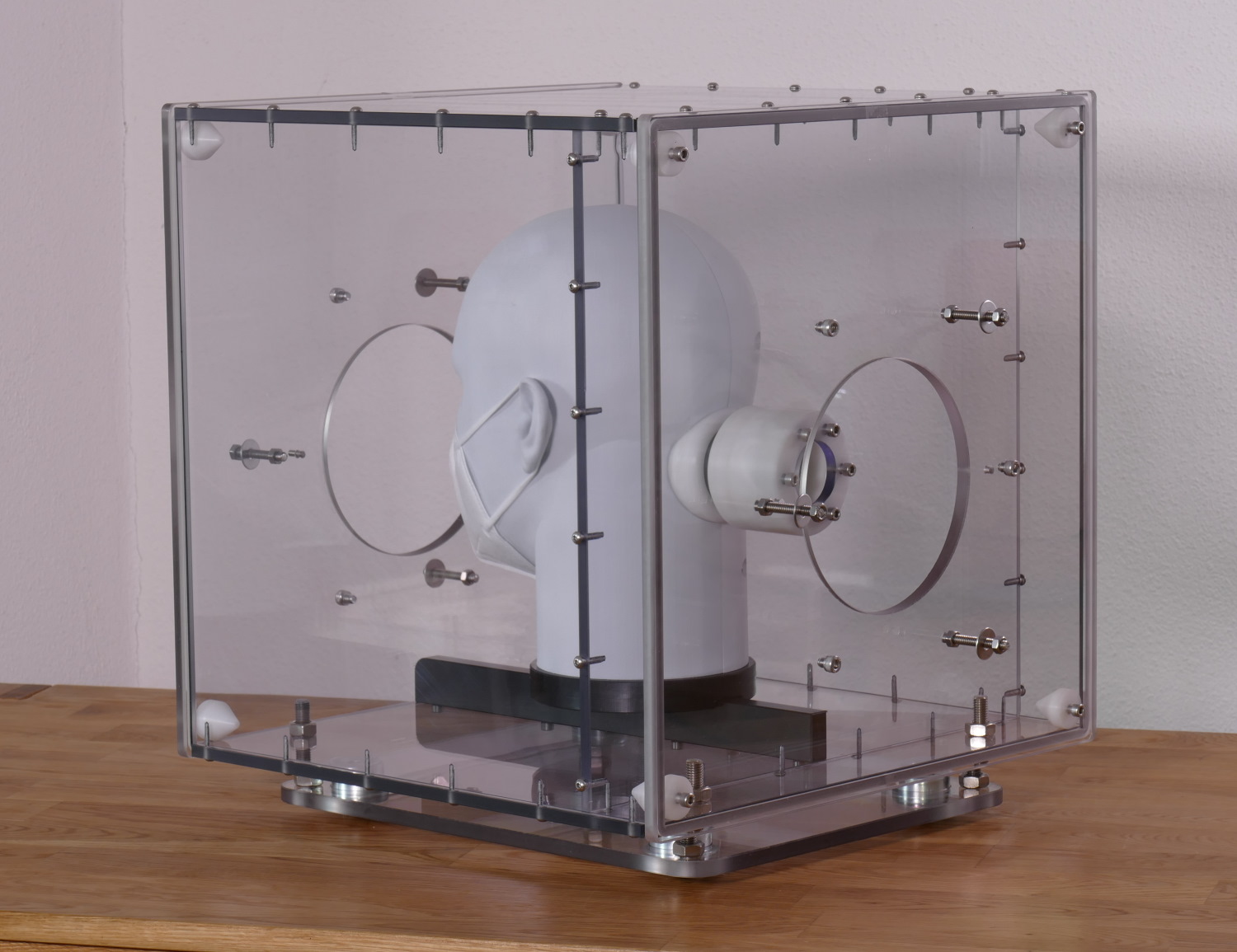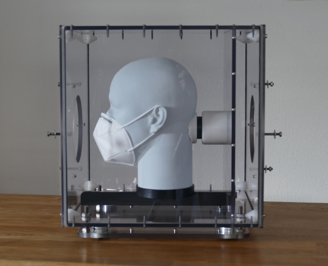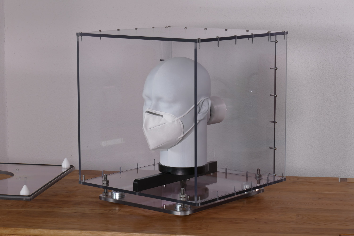 Um eine realitätsnahe Testung von Atemschutzmasken durchführen zu können, wurde diese Prüfkammer für einen Partikelfilter- Prüfstand in Zusammenarbeit mit Fa. Fiatec (Filter & Aerosol Technologie) entwickelt. Der Prüfkopf ist um 180 ° drehbar, sodass Ein- und Ausatmung simuliert werden können. Ziel ist es, eine Normung für Pandemiemasken voran zu treiben.