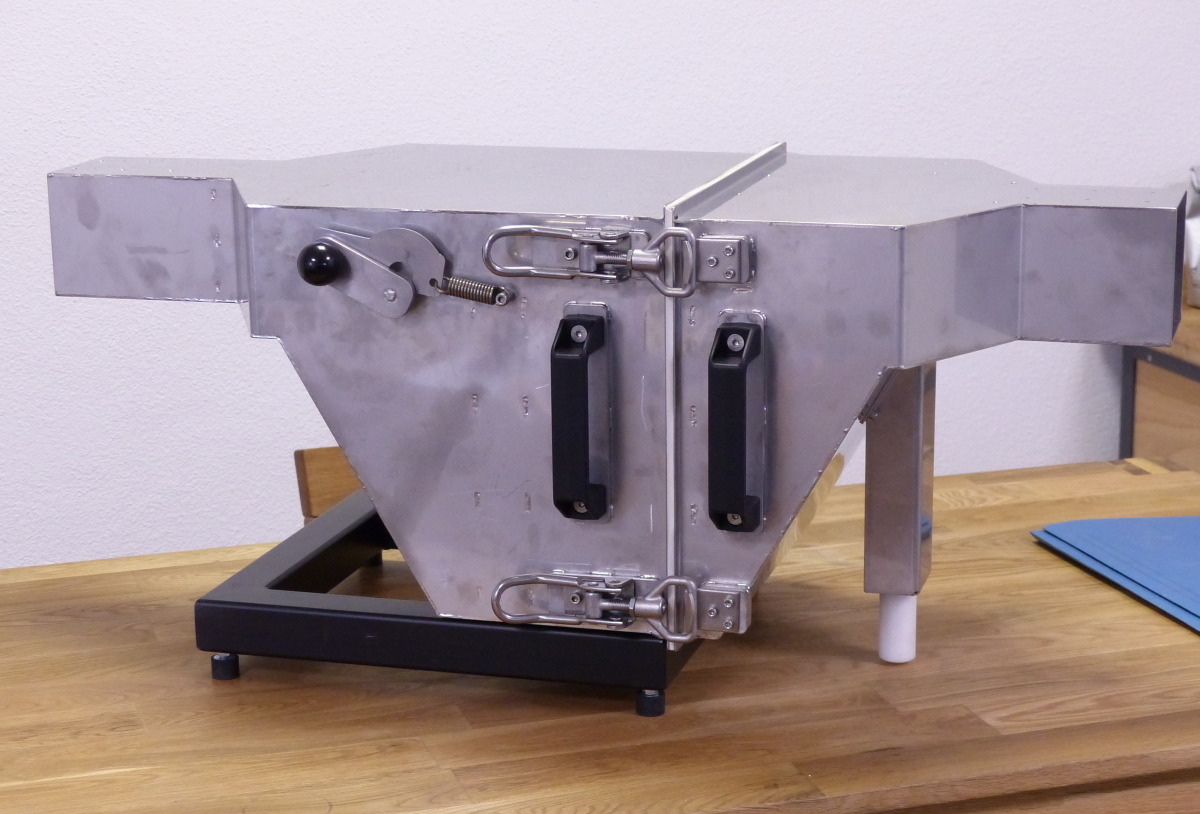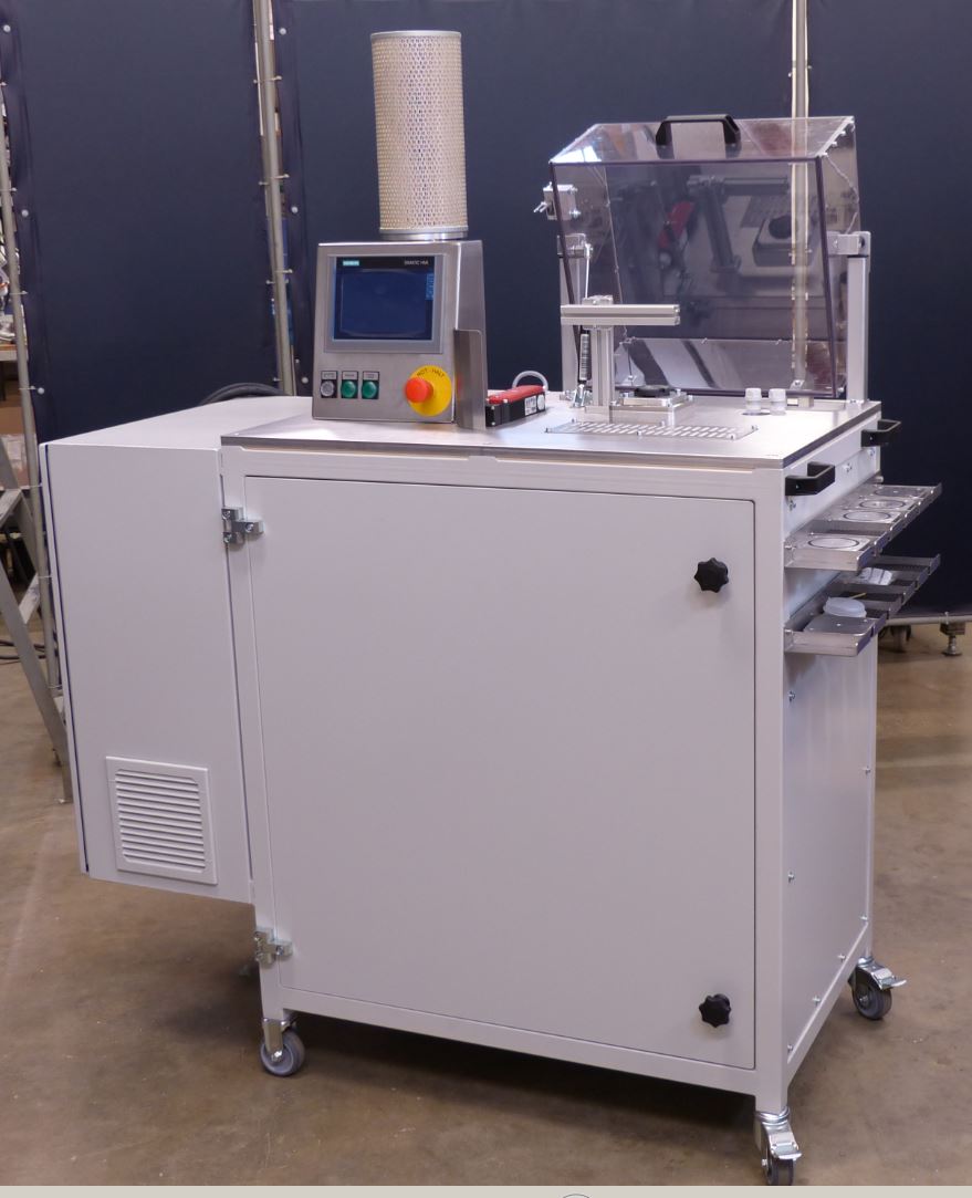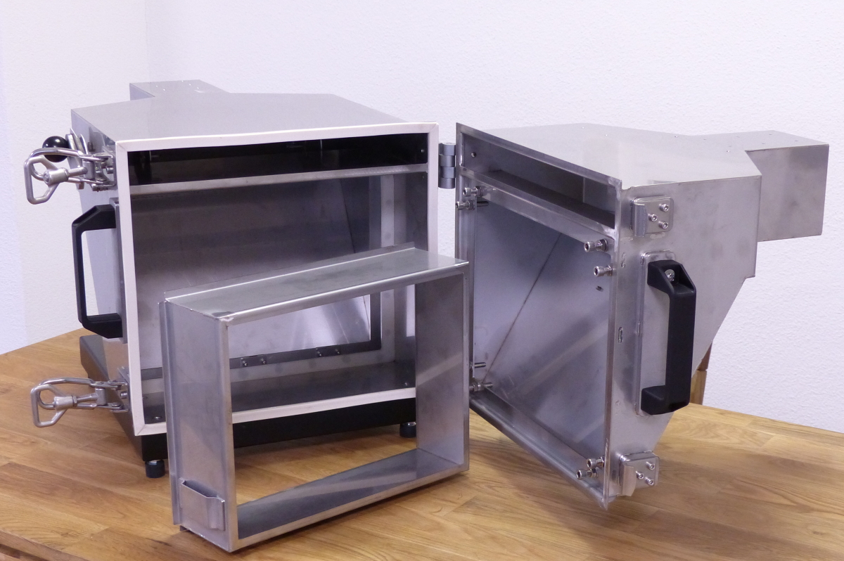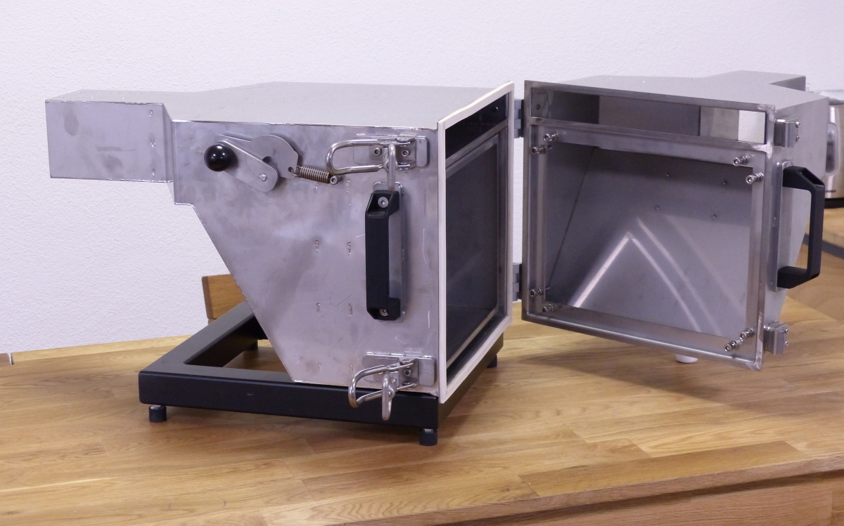 Um eine realitätsnahe Testung von Atemschutzmasken durchführen zu können, wurde diese Prüfkammer für einen Partikelfilter- Prüfstand in Zusammenarbeit mit Fa. Fiatec (Filter & Aerosol Technologie) entwickelt. Der Prüfkopf ist um 180 ° drehbar, sodass Ein- und Ausatmung simuliert werden können. Ziel ist es, eine Normung für Pandemiemasken voran zu treiben.