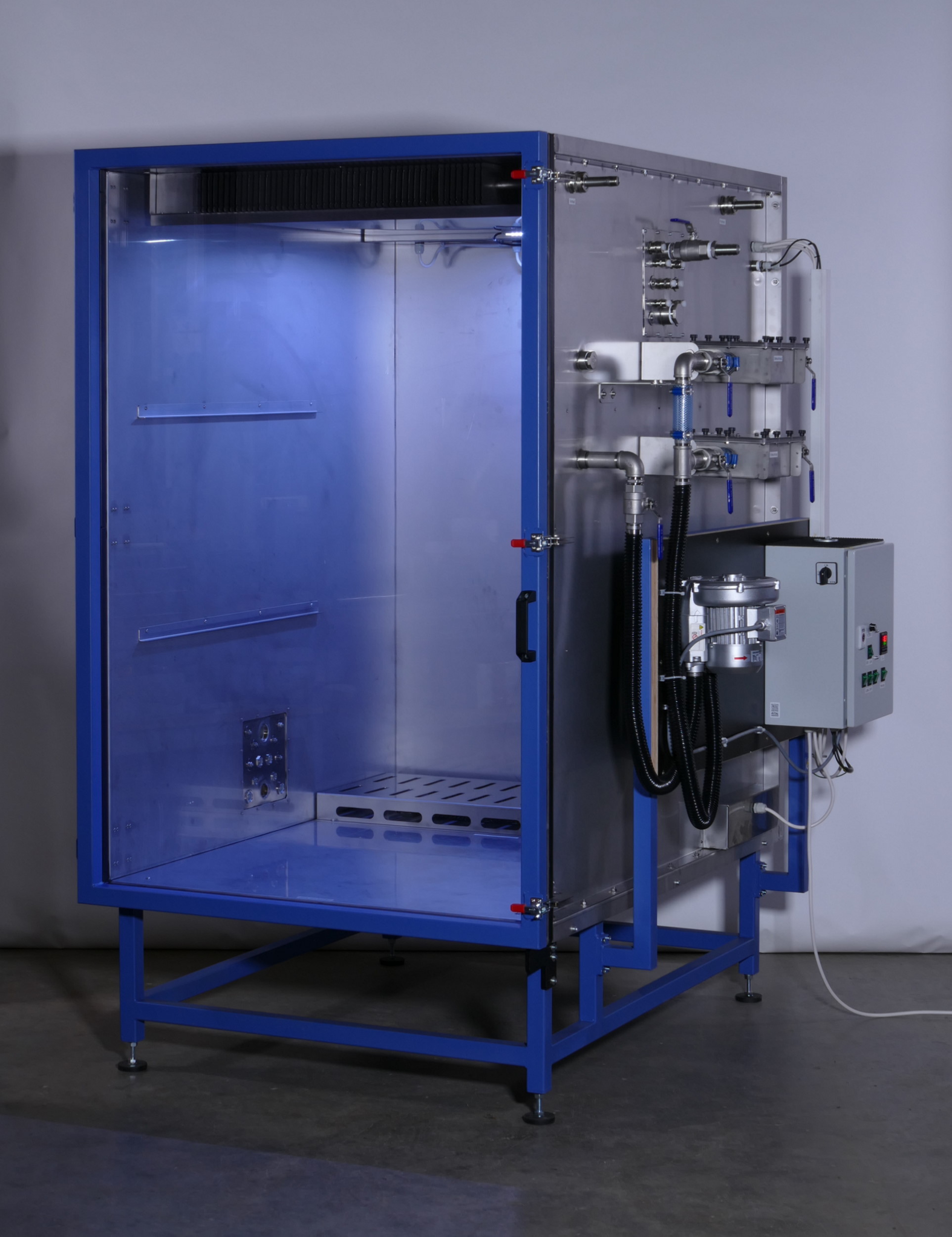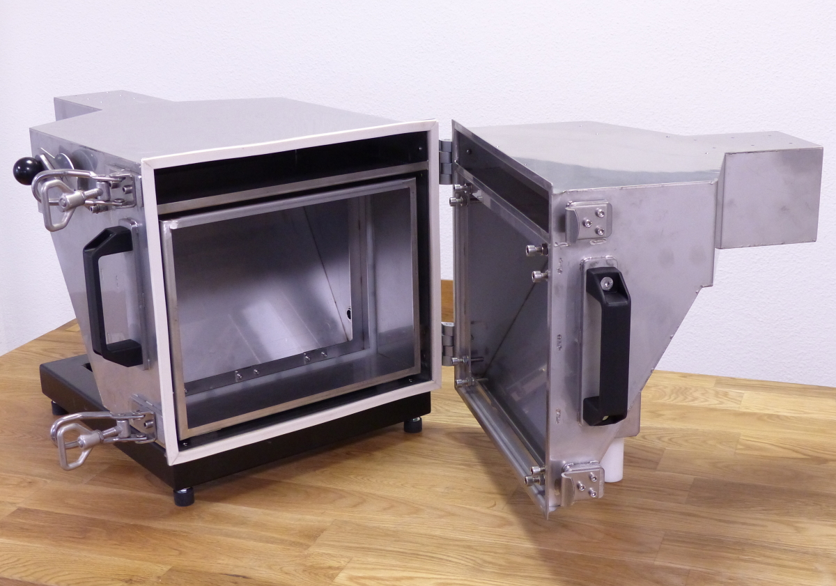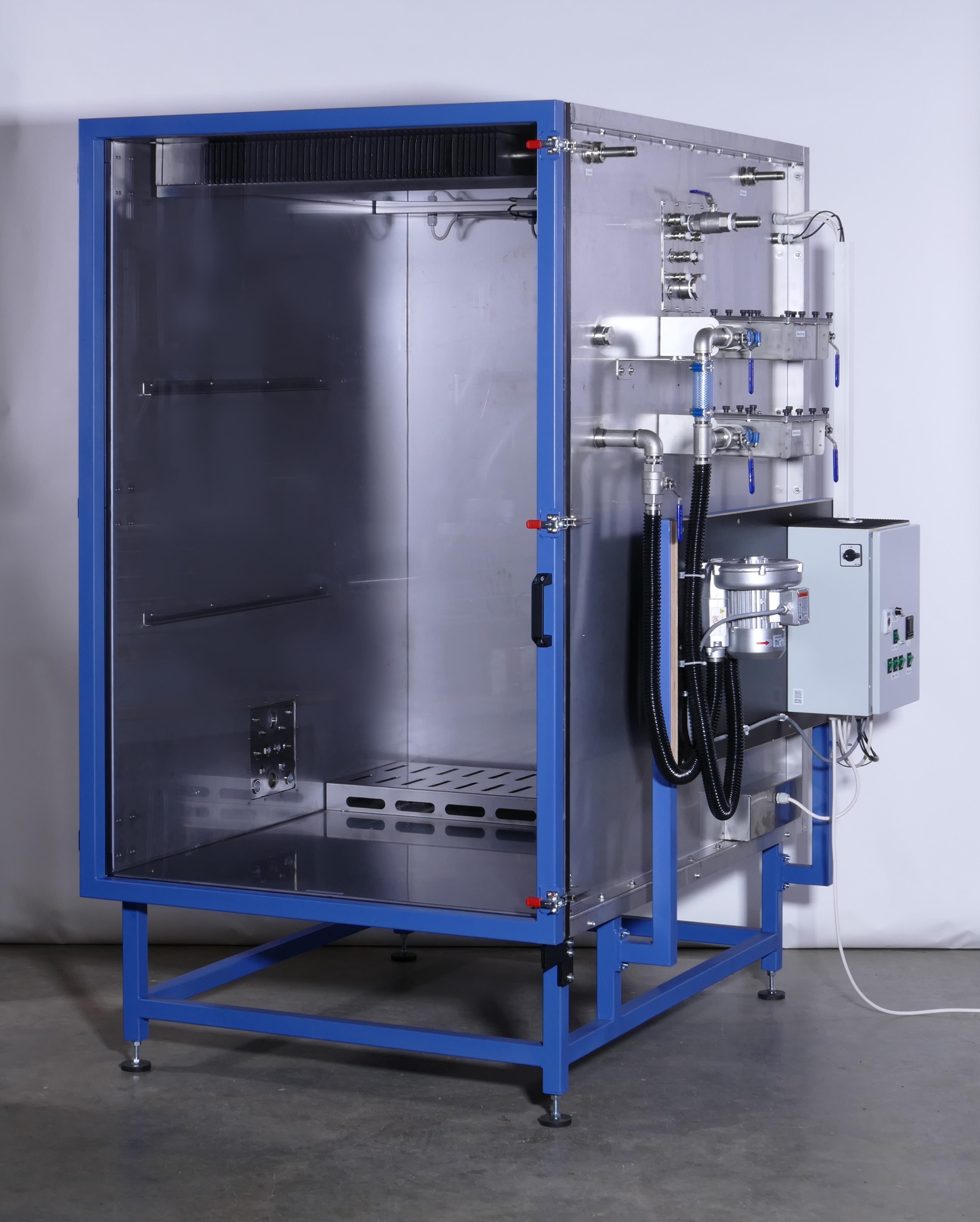 Um die Effizienz von Raumluftreinigern zu ermitteln wurde diese Prüfkammer konzipiert. Das Innenvolumen von 2m³ lässt sich kühlen, heizen, befeuchten und entfeuchten. Eine großformatige Türe aus Polycarbonat erleichtert Zugang und Sichtbarkeit. Durch die Verwendung von korrosionsfesten Materialien wird eine unerwünschte Reaktion mit den Prüfgasen vermieden.